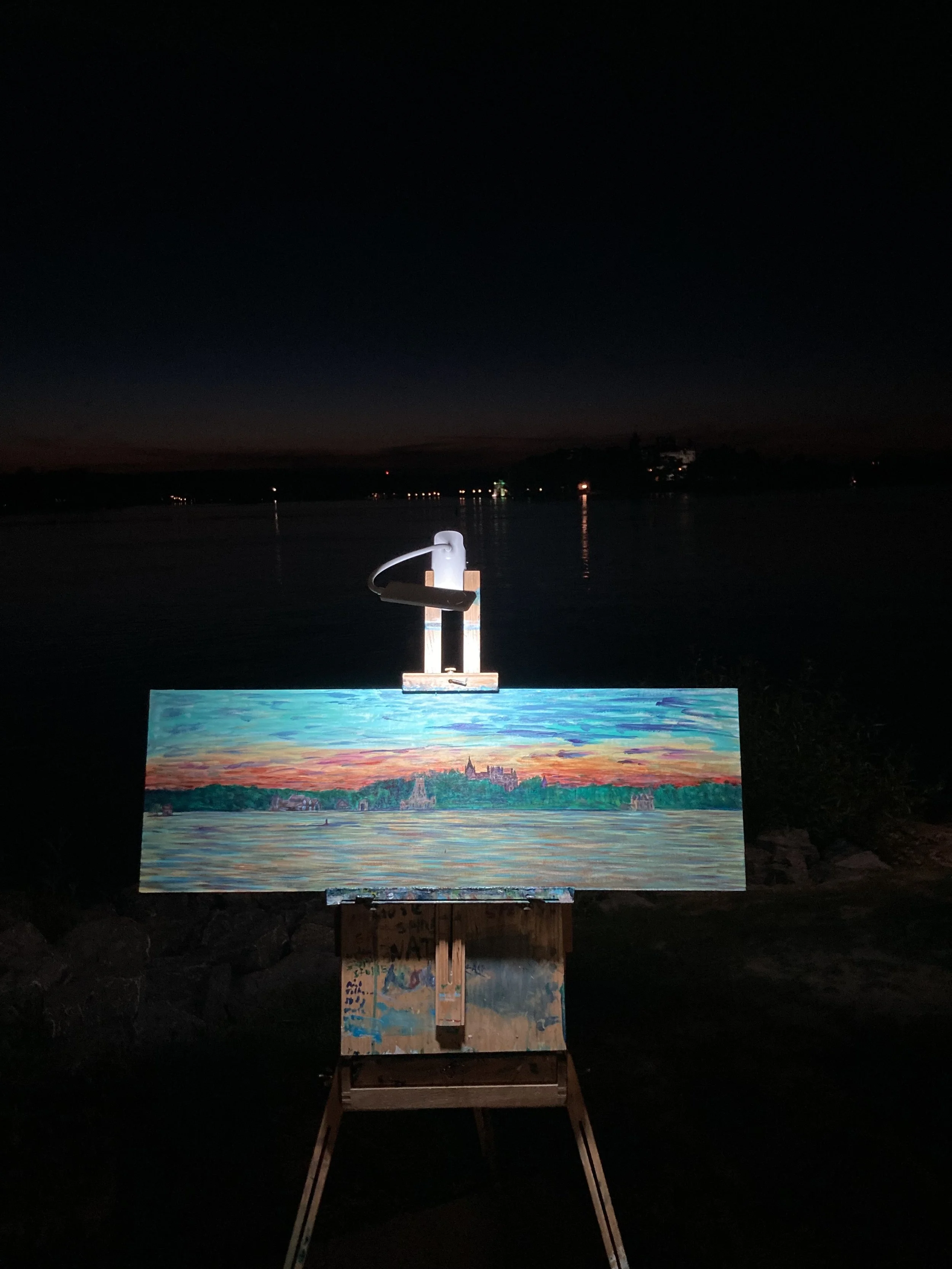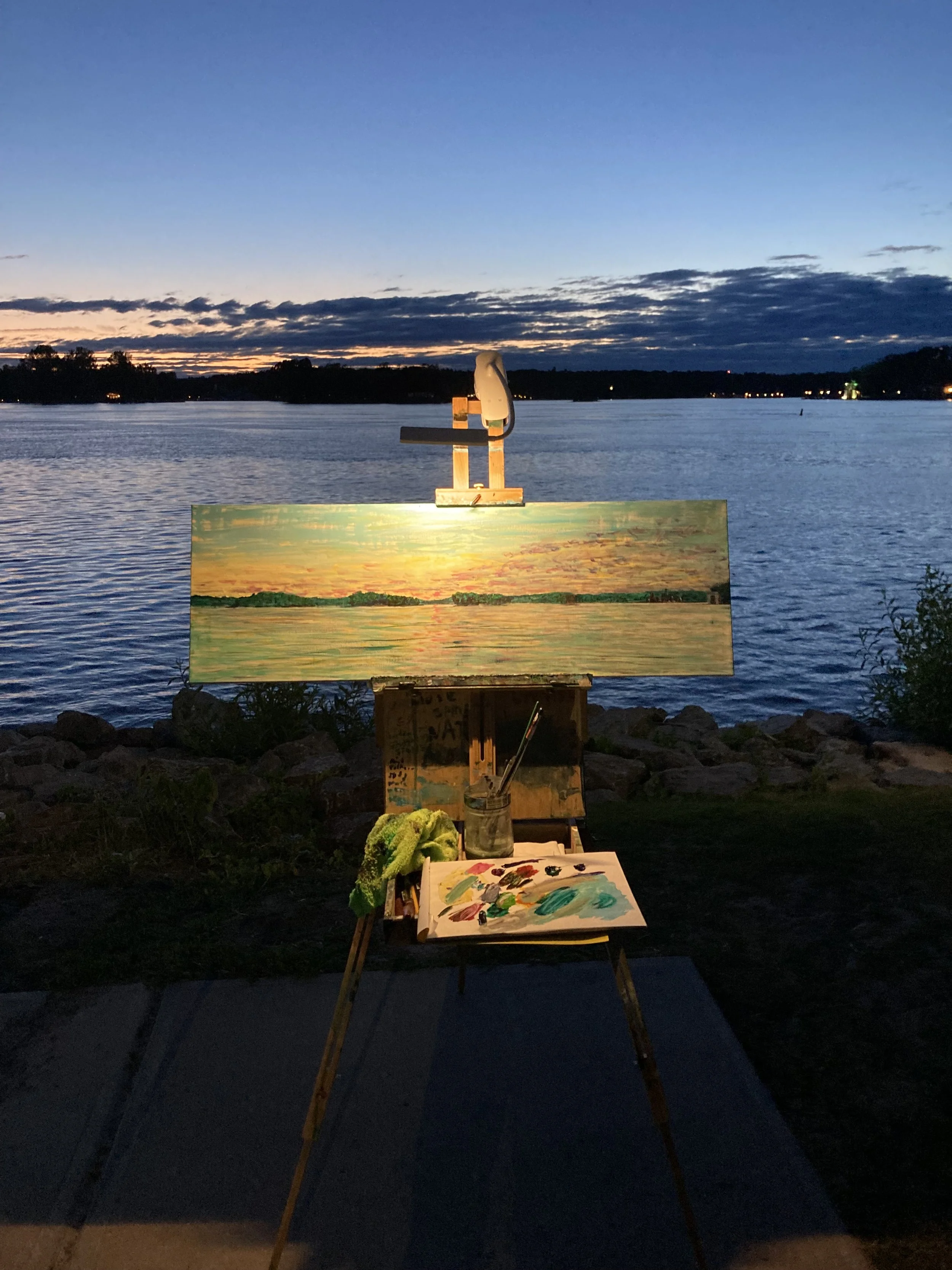 I found an endless supply of inspiration, painting from life by the water, and on the streets. At night I would paint nocturnes using a portable led lamp to illuminate my canvas. I was busy with work during the day, but I had plenty of time in the evenings to paint sunsets from various locations. I even set up to paint in the crowd during the popular 4th of July fireworks show over Boldt Castle. I’ve sold many of these paintings to locals from Alex Bay and the surrounding areas, and have been commissioned to paint special scenes of various buildings in the village.